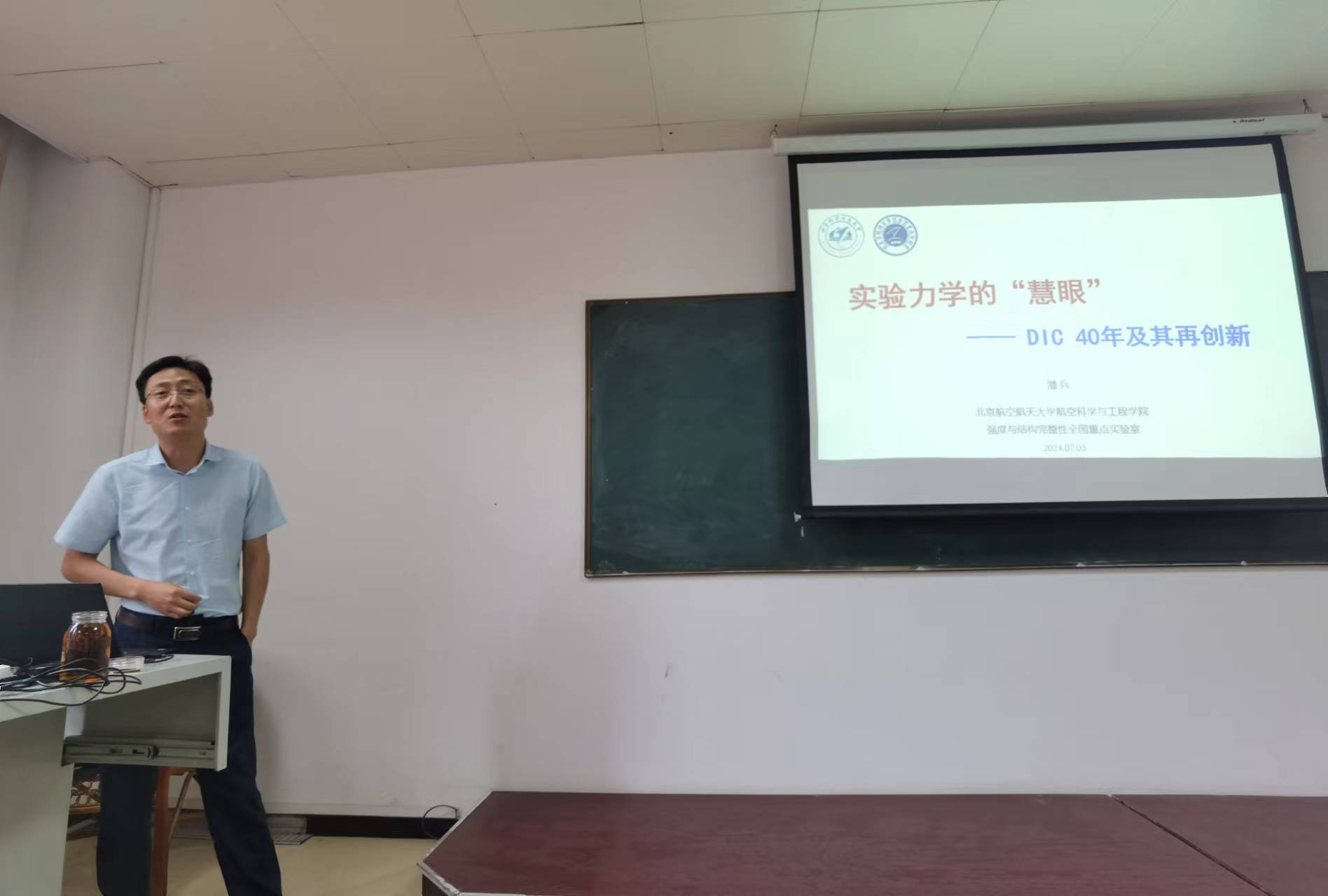 报告会上,潘兵教授从DIC的起源、近40年的发展历程、DIC再创新、总结思考和未来发展等方面向师生们进行了详细的介绍。首次创新性提出一种基于单个彩色CCD相机的全靶面;在“第一代”IC-GN算法的基础上进行改进,得到更精准有效的“第二代”IC-GN算法,成为了DIC算法新基石;完成了单相机平面二维到双相机曲面三维成像的飞跃,提出一种四平面镜辅助三相机三维变形的测量方法,并将其应用于生物力学、动力学等多个领域的应变测量;在高温DIC再创新方面,发明了抗强热辐射干扰的蓝光、紫外主动成像技术,从成像系统设计抑制强热辐射干扰问题,并利用深度学习对散斑图像序列中的热雾畸变进行修正,使热雾误差降低了近10倍。