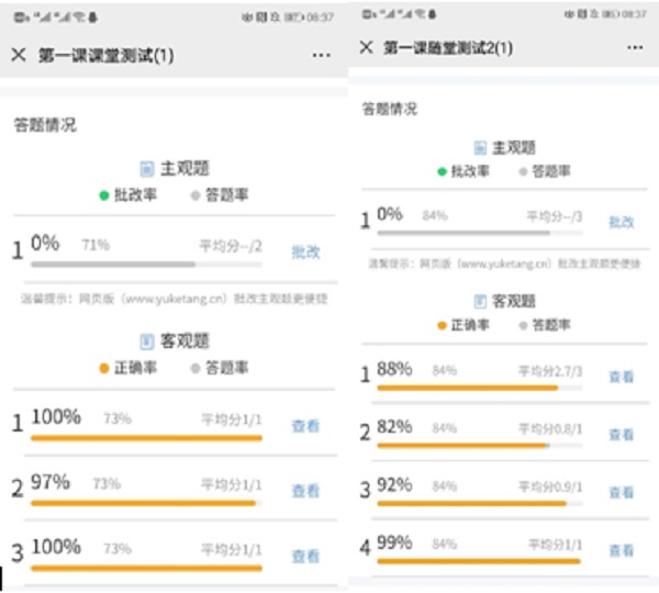 结合两次课程的直播和学生反馈来看,学生课堂互动踊跃,教学效果良好,通过课后习题结果来看,两次测试的客观题得分率较高,基本都达到了教学目标。