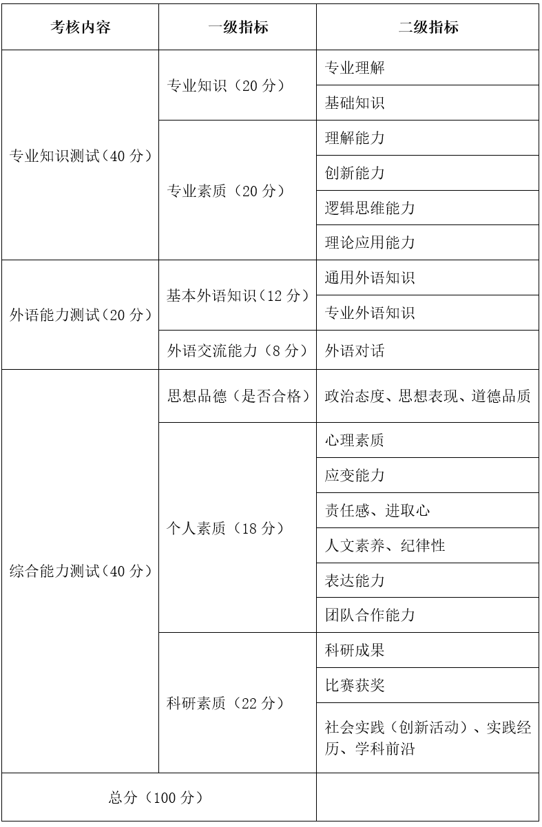 综合能力测试(满分40分)。主要包括对申请者既往学业、一贯表现、科研能力、综合素质、社会实践和思想品德等情况进行全面考察。其中思想政治素质和道德品质考核结果不以具体分数体现,以“合格”或“不合格”体现,考核结果“不合格”者不予接收。申请者应提供成绩单,科技竞赛获奖证明,发表的学术论文和授权的国家专利证书等证明材料。考核方式为随机问答。