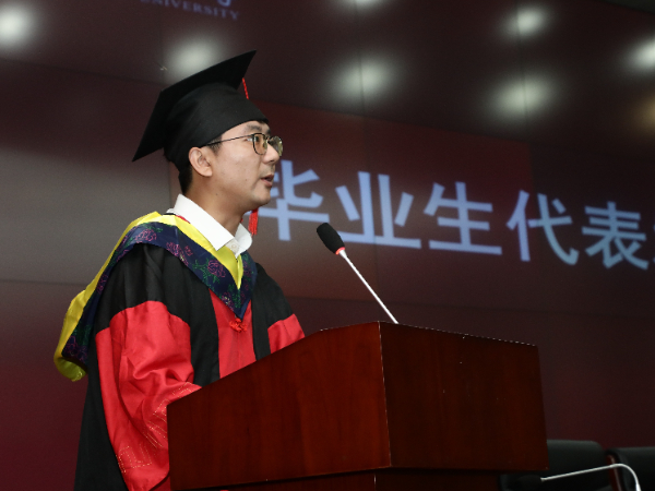 典礼第六项,由毕业生代表发言。他们分别是2020级仪器与科学技术专业博士生刘旭以及2020级机械设计制造及其自动化专业孙策。他们回忆了在校时期的点点滴滴,向看球直播