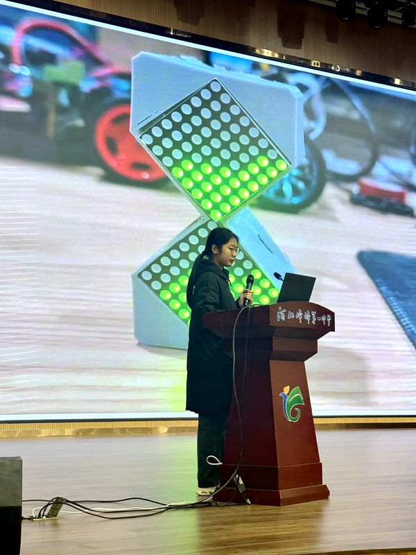 吴文浩和李金硕采用实物展演和视频展播相结合的方式为在场的高中学生们带来了一场精彩的科普讲座。两位同学介绍了原创科技作品《双轮平衡车》、《智能寻迹车》、《双车协同系统》、《电子沙漏》的设计思路、研发原理、应用价值等内容,并邀请在场高中学生们上台现场体验,通过理论讲述和实践模拟切实激发了在场高中生们对科学的探索热情和对求知的内心渴望,对于在今后学习和生活中发掘和开拓他们的科学素养和创新精神具有重要意义。